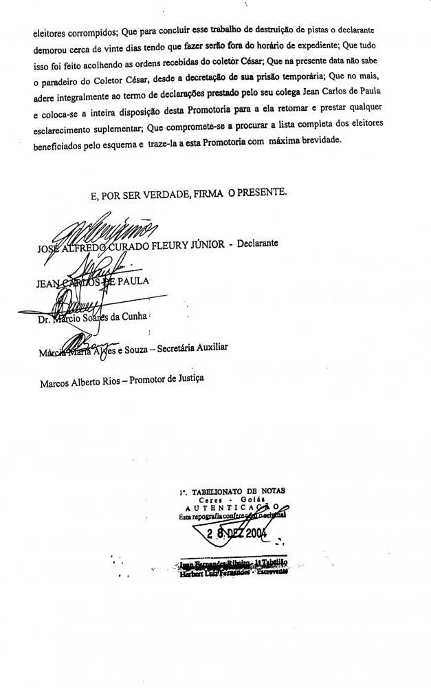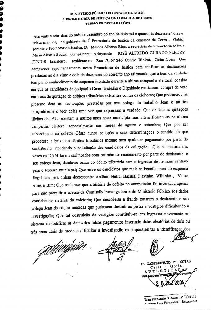 MINISTÉRIO PUBLICOAos vinte sete dias do mês de dezembro do ano de dois mil e quatro, às dezessete horas e trinta minutos, no gabinete da 2ª promotoria de justiça da comarca de Ceres- Goiás, perante o promotor de justiça Dr. Marcos Alberto Rios, secretária de promotoria Márcia Maria Alves e Souza, compareceu o depoente Jose Alfredo Curado Fleury Junior, Brasileiro, residente na Rua 17, número 246, Centro Rialma Goiás.