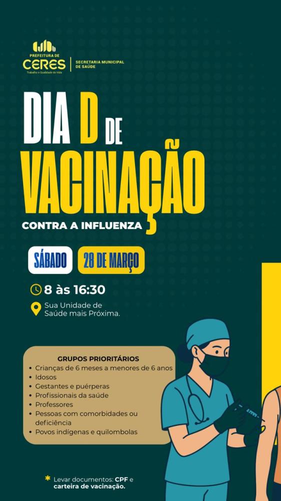 Neste sábado, dia 28 de março, todas as Unidades de Saúde estarão abertas das 8h às 16h30 para vacinação.